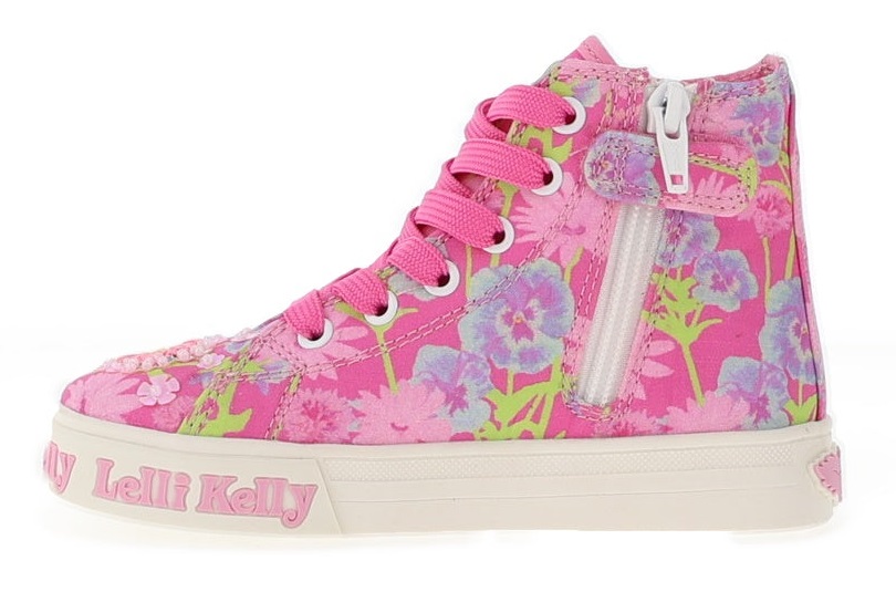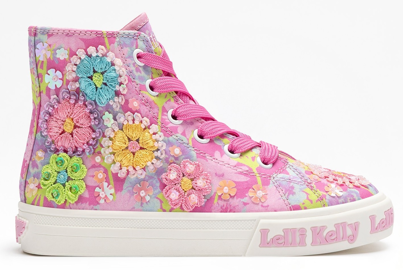 Lelli Kelly Carrie Mid Baseball Boots come in a multicoloured canvas, decorated with Flowers set on a floral background.