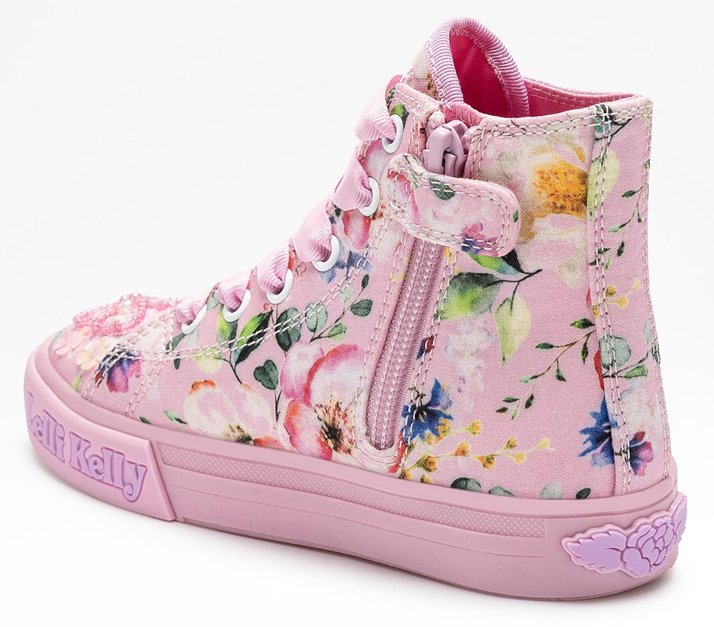 Lelli Kelly Serena Mid Baseball Boots come in a multicoloured canvas, decorated with Butterfly on a floral background.